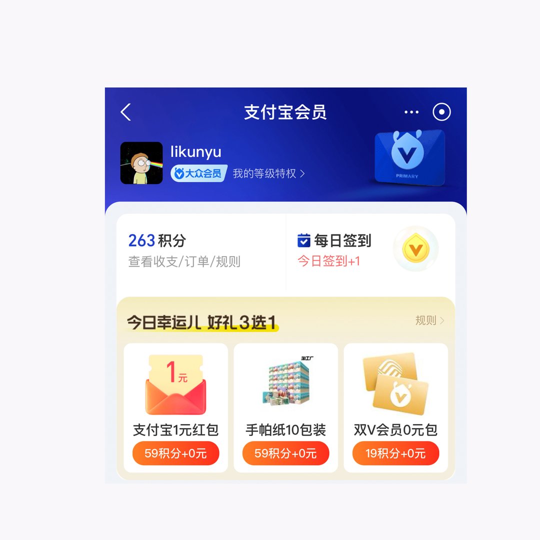 支付宝积分可以兑换红包或者手帕纸,还有双V会员,虽然用处不多,还是有点儿用。