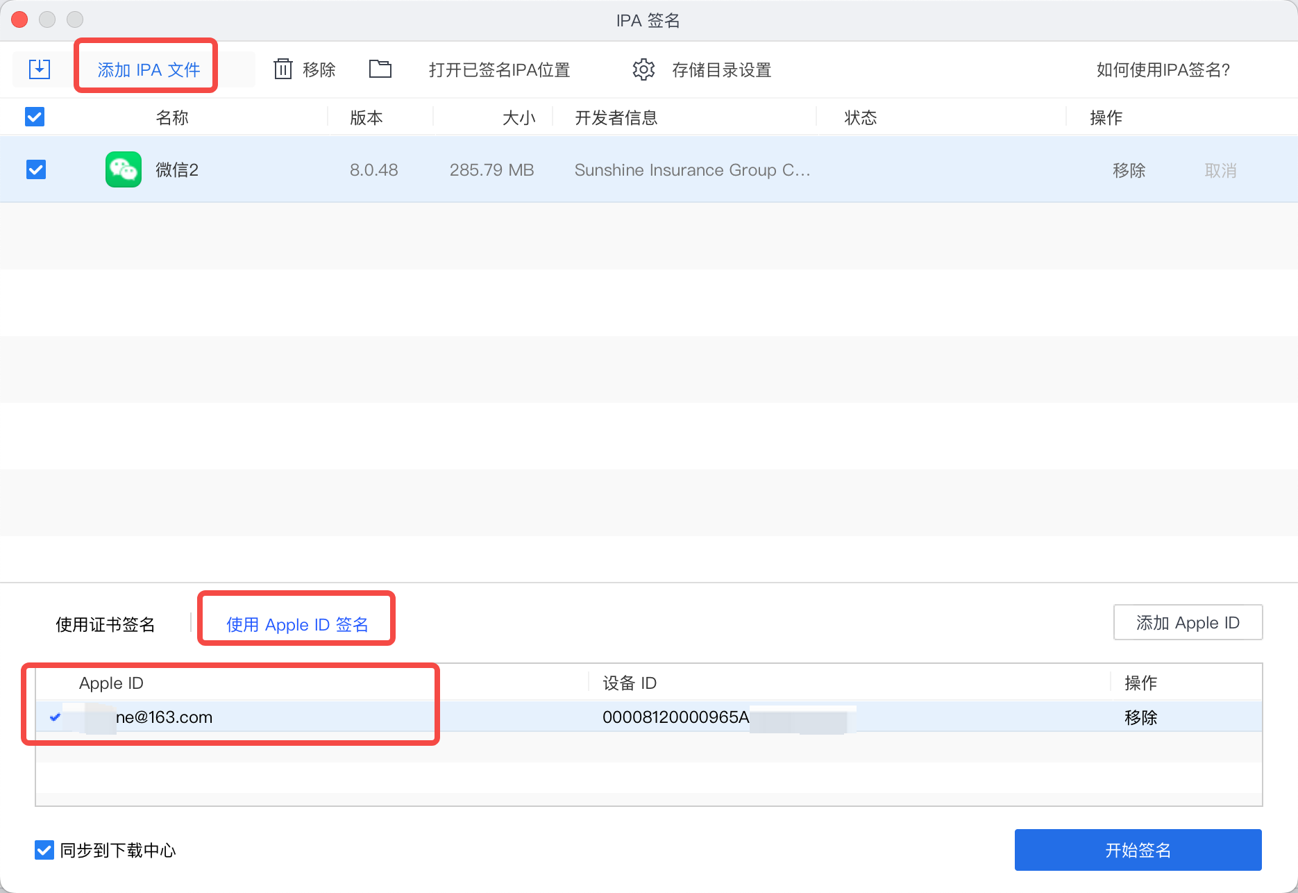 把下载好的微信安装包添加进去,用你的苹果账号进行签名。这个过程可能需要等待几分钟,耐心点直到显示签名成功。