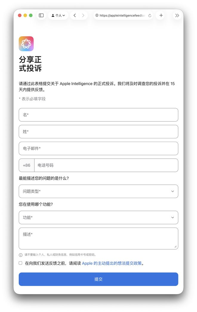 这个页面名为“分享正式投诉”,要求用户填写姓名、+86中国大陆手机号并描述功能相关问题,苹果还承诺会及时调查并在15个工作日内反馈。