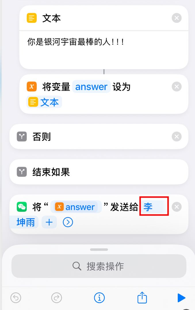 在快捷指令最底部,找到联系人设置,把「李坤雨」改成你想要接收夸夸的微信好友备注名。改好后手动运行一次试试,看看能不能成功发送。