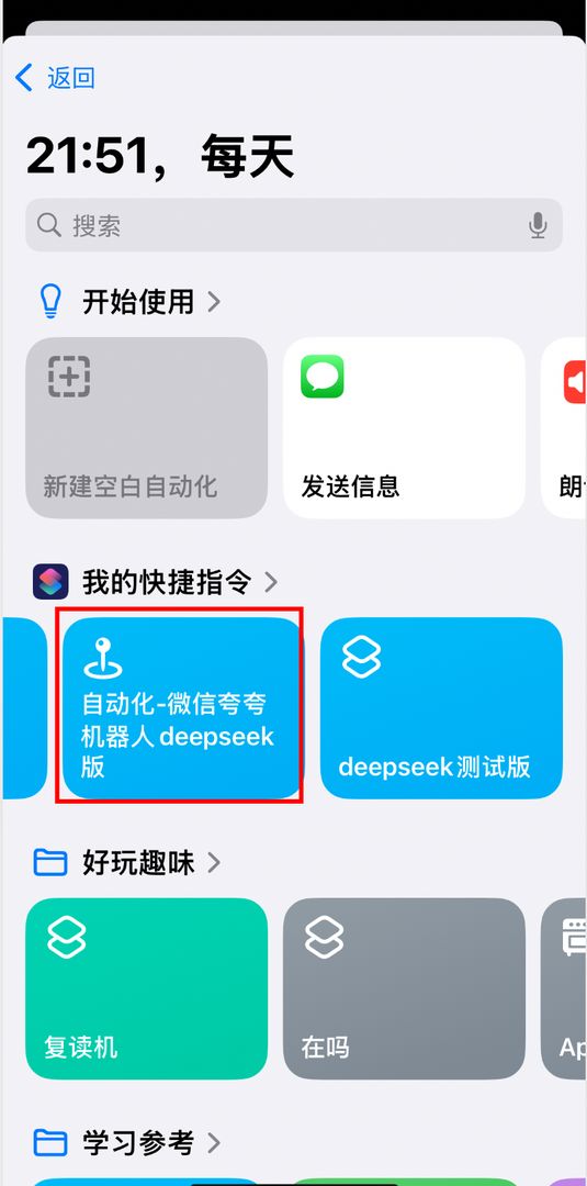 打开快捷指令的自动化功能,新建一个自动化任务。选择特定时间触发,比如每天早上5点。然后选择「自动化-微信夸夸机器人deepseek版」这个快捷指令。